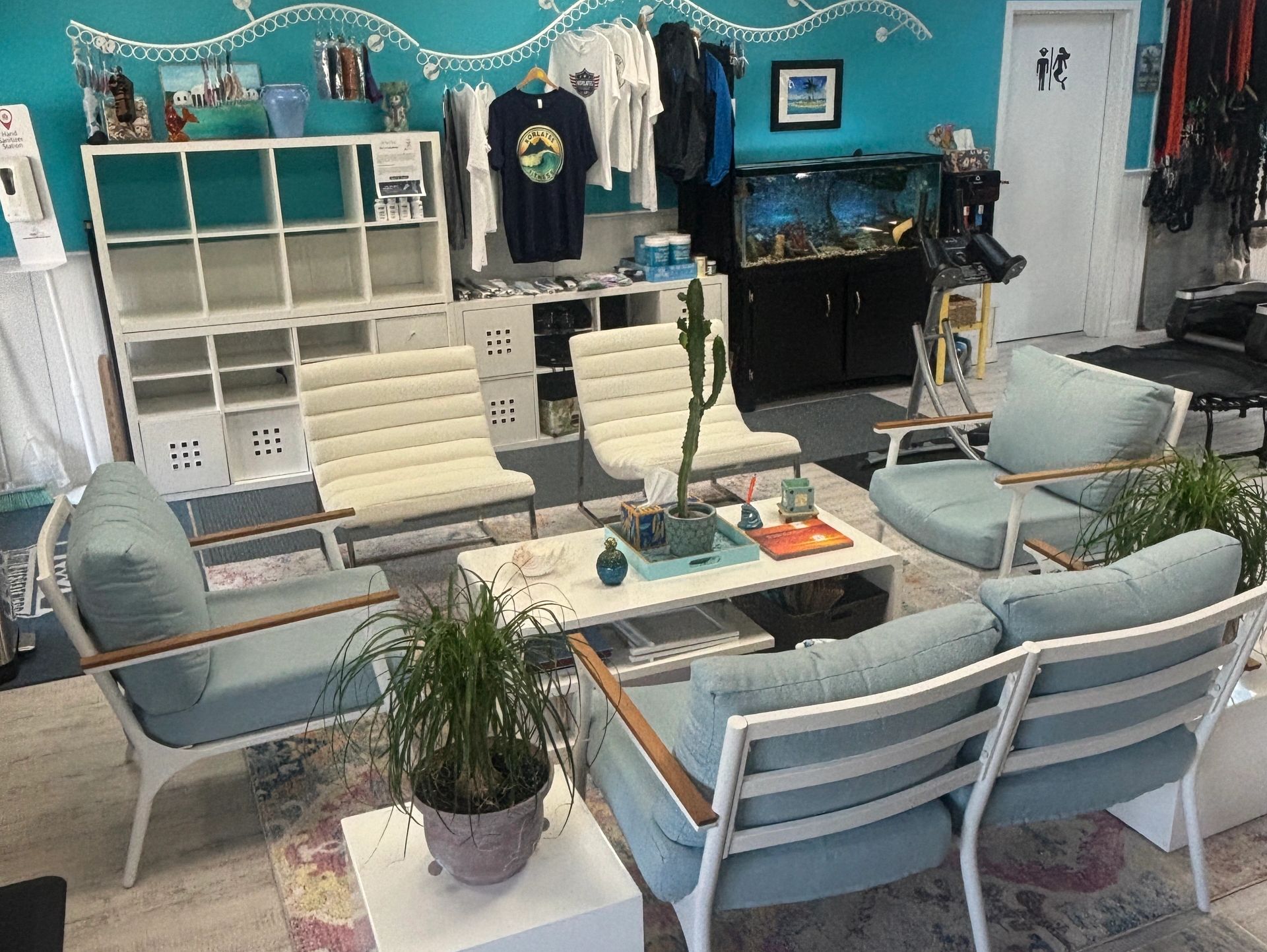 Welcome to Korlates Fitness. Sit down and take off your shoes.