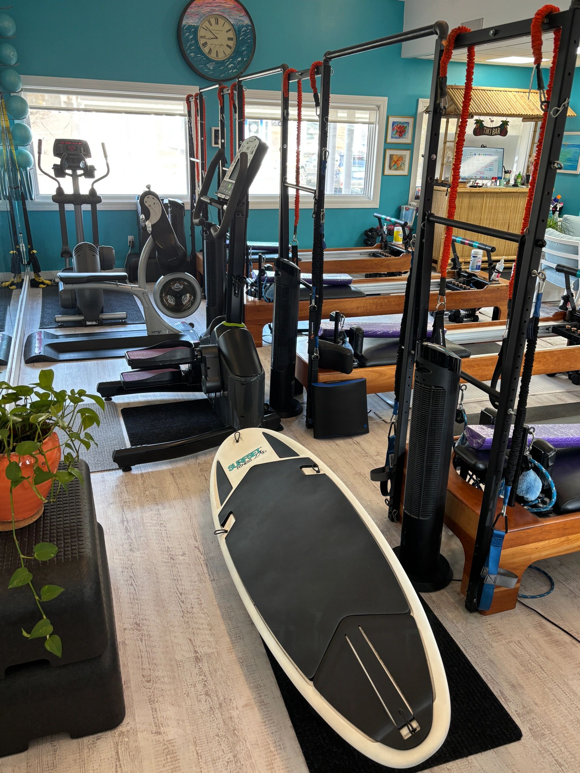 8 Extra long and extra wide custom reformers. Typical reformers are too small for a taller person. Each machine also has its own fan so you stay cool.