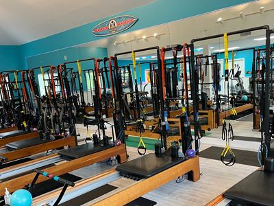 8 participants participate in 55 minute classes made up of Pilates-based exercises performed on professional reformer machines with towers, unique cardiovascular machines, kettle bells, mini trampolines, TRX suspension systems, jump boards, resistance cords, weighted hula hoops, medicine balls, and other fitness tools to add variety and challenge.